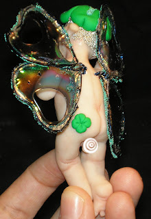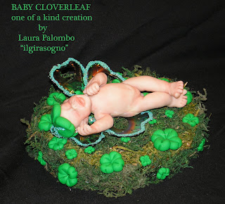 BABY QUADRIFOGLIO OOAK creazione unica e irriproducibile è modellato a mano senza l'uso di stampi e dipinto con colori alchidici di alta qualità opportunatamente fissati in cottura la base è in legno naturale ricoperta di muschio secco e quadrifogli modellati a mano in fimo, le ali sono in fantasy film iridescente decorate da microsfere verdi lo trovate in ebay e nel nostro negozio etsy