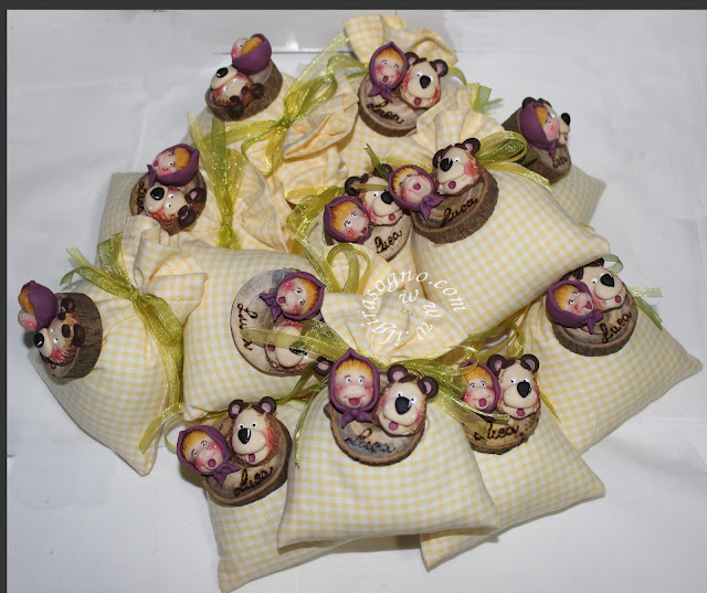 Sono calamite con i fantastici Masha & Orso che tutti i bambini (e non solo ) adorano , sono modellate e dipinte a mano in porcellana fredda e per richiamare la casa di orso ,che nel cartone è un tronco di un albero, ho deciso di posizionarle su una rotellina di legno naturale su cui ho inciso a fuoco il nome del bimbo, sono un ricordo carinissimo per i bimbi che partecipano alla festa di compleanno!