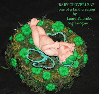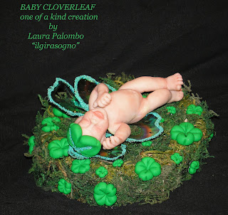 BABY QUADRIFOGLIO OOAK creazione unica e irriproducibile è modellato a mano senza l'uso di stampi e dipinto con colori alchidici di alta qualità opportunatamente fissati in cottura la base è in legno naturale ricoperta di muschio secco e quadrifogli modellati a mano in fimo, le ali sono in fantasy film iridescente decorate da microsfere verdi lo trovate in ebay e nel nostro negozio etsy