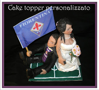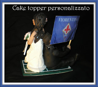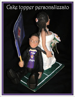 Cake topper per una coppia che si sposerà a fine APRILE,personalizzato, lui maglia e bandiera della fiorentina, il prato trasformato in campo da calcio e lei lo trascina via prendendolo dalla cravatta!!!