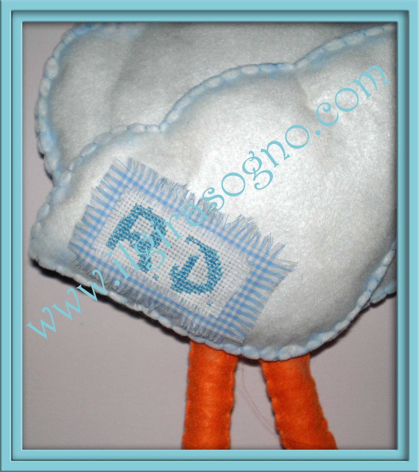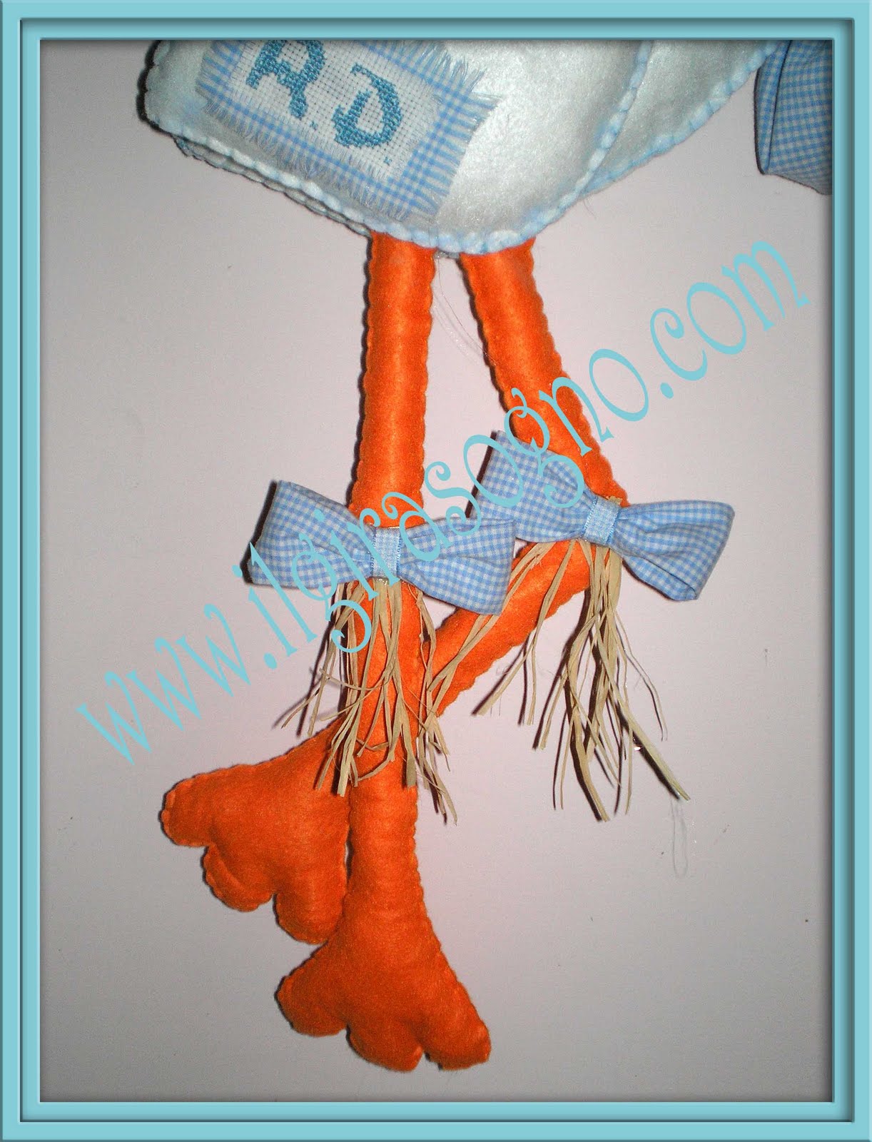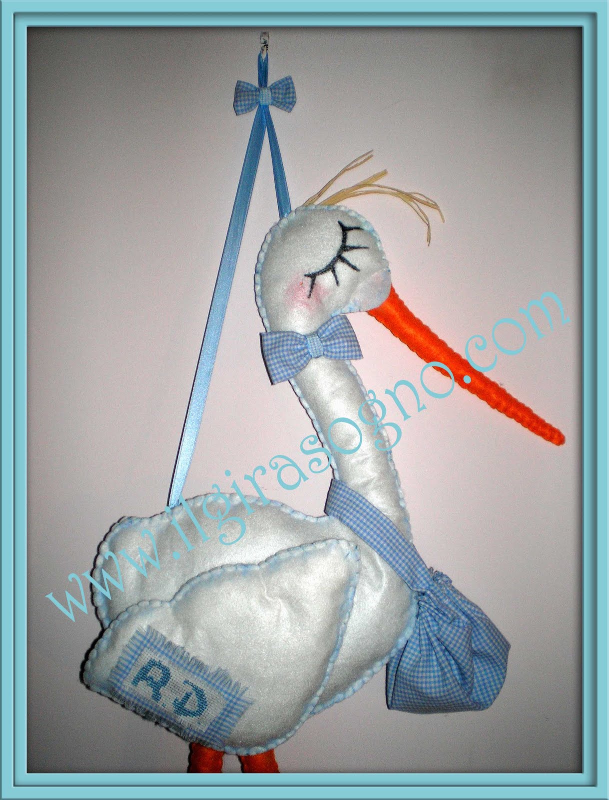La cicogna misura 80 cm è rifinita nei minimi particolari completamente cucita a mano ogni applicazione è realizzata con cura, le iniziali del piccolino sono ricamate a mano a punto croce, il sacchetto è imbottito con della vaniglia.