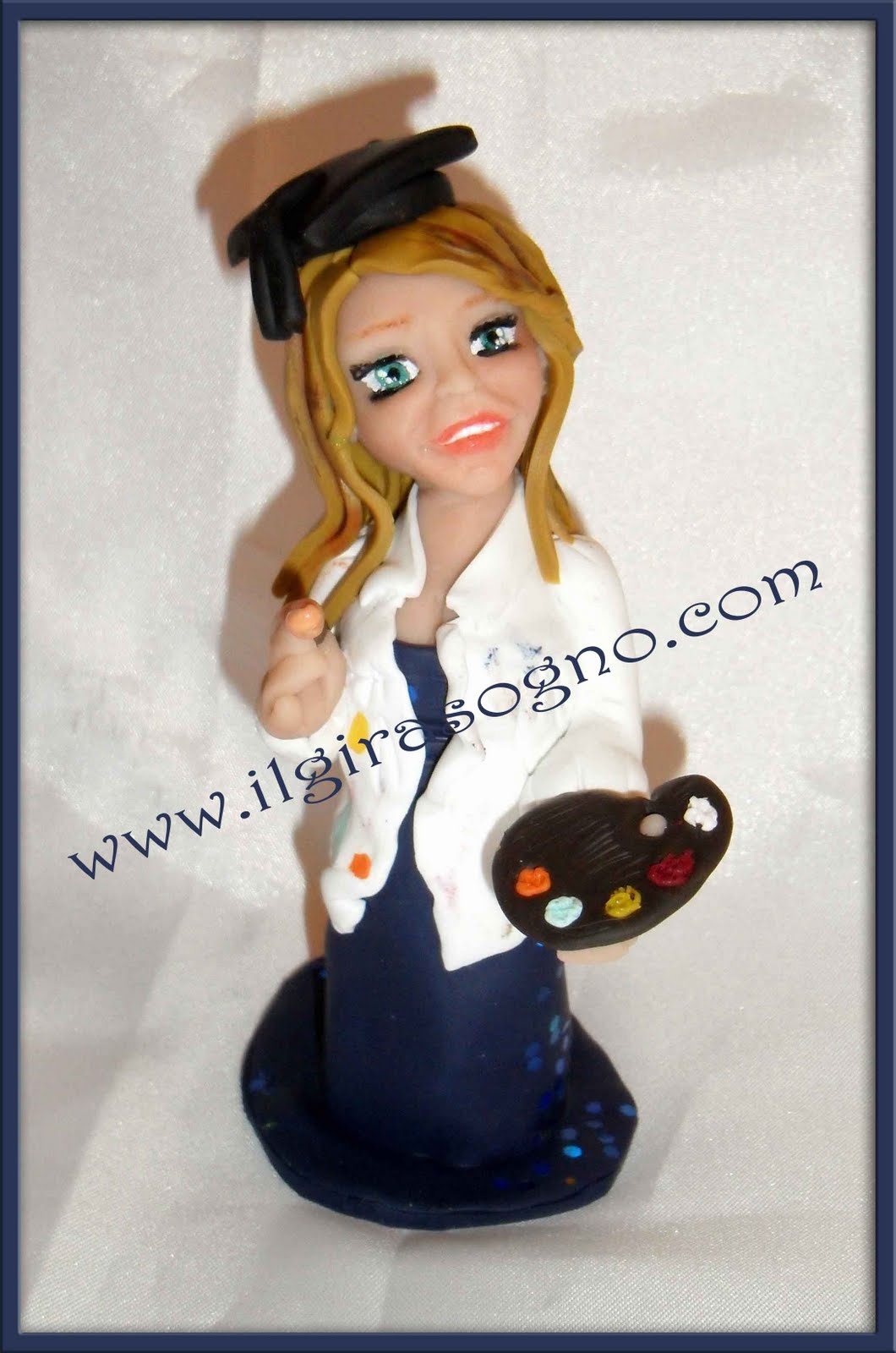 Cake topper caricatura realizzato per una ragazza che si laurea in PITTURA, la particolarità è che lei veste sempre molto elegante così sotto il camice da pittore ha un vestito da sera con strass!!