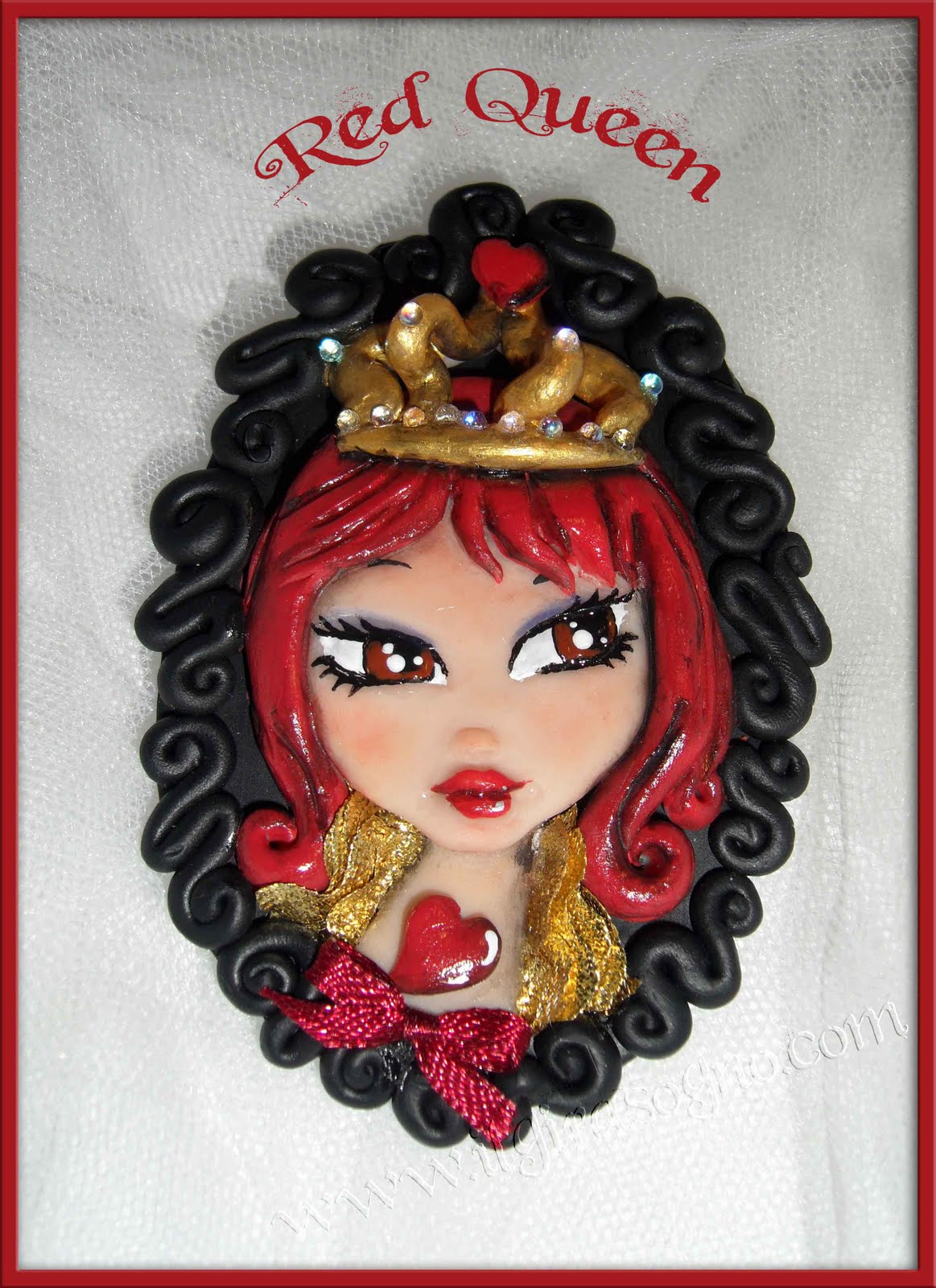 Eccola qui a grande richiesta la spilla RED QUEEN in limited edition, è modellata in prosculpt e fimo senza uso di stampi, le applicazioni sono in stoffa , passamaneria e micro glass bubble iridescenti.