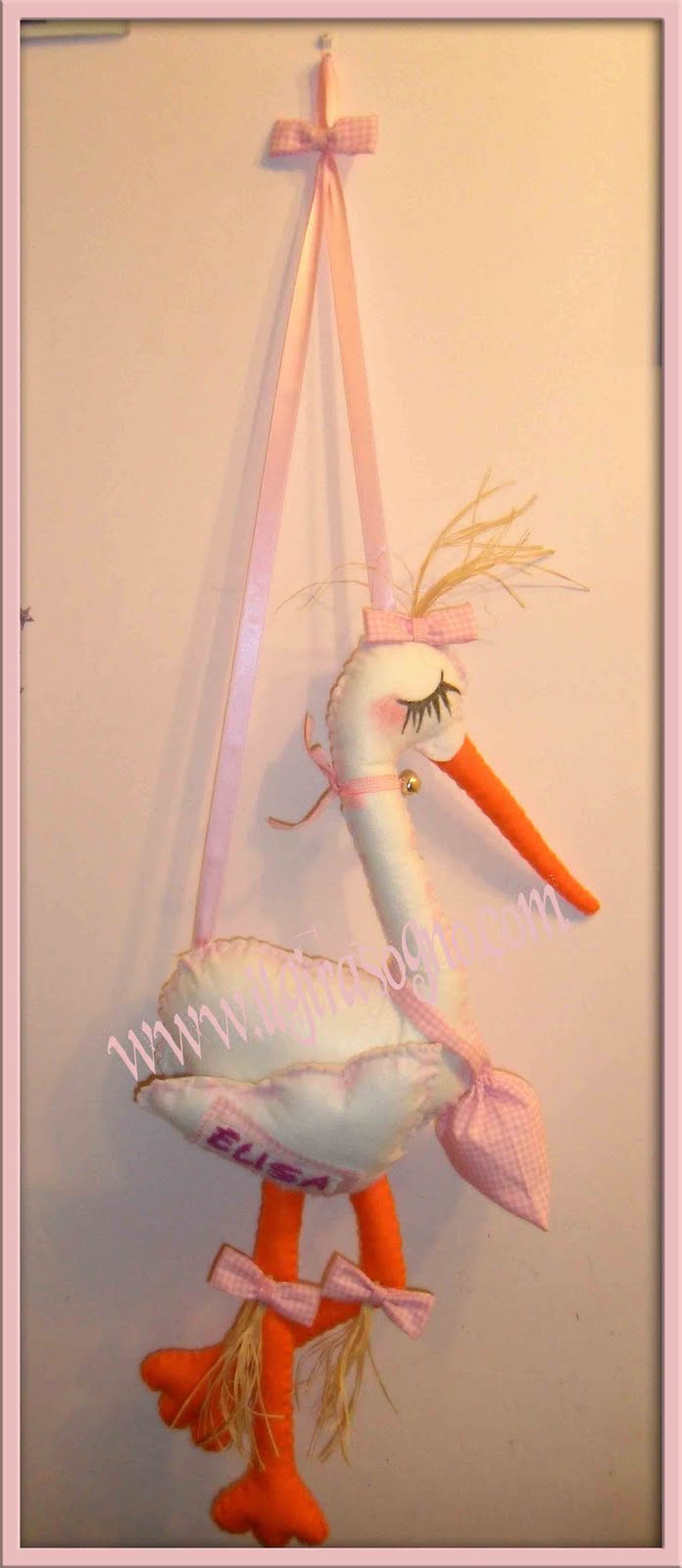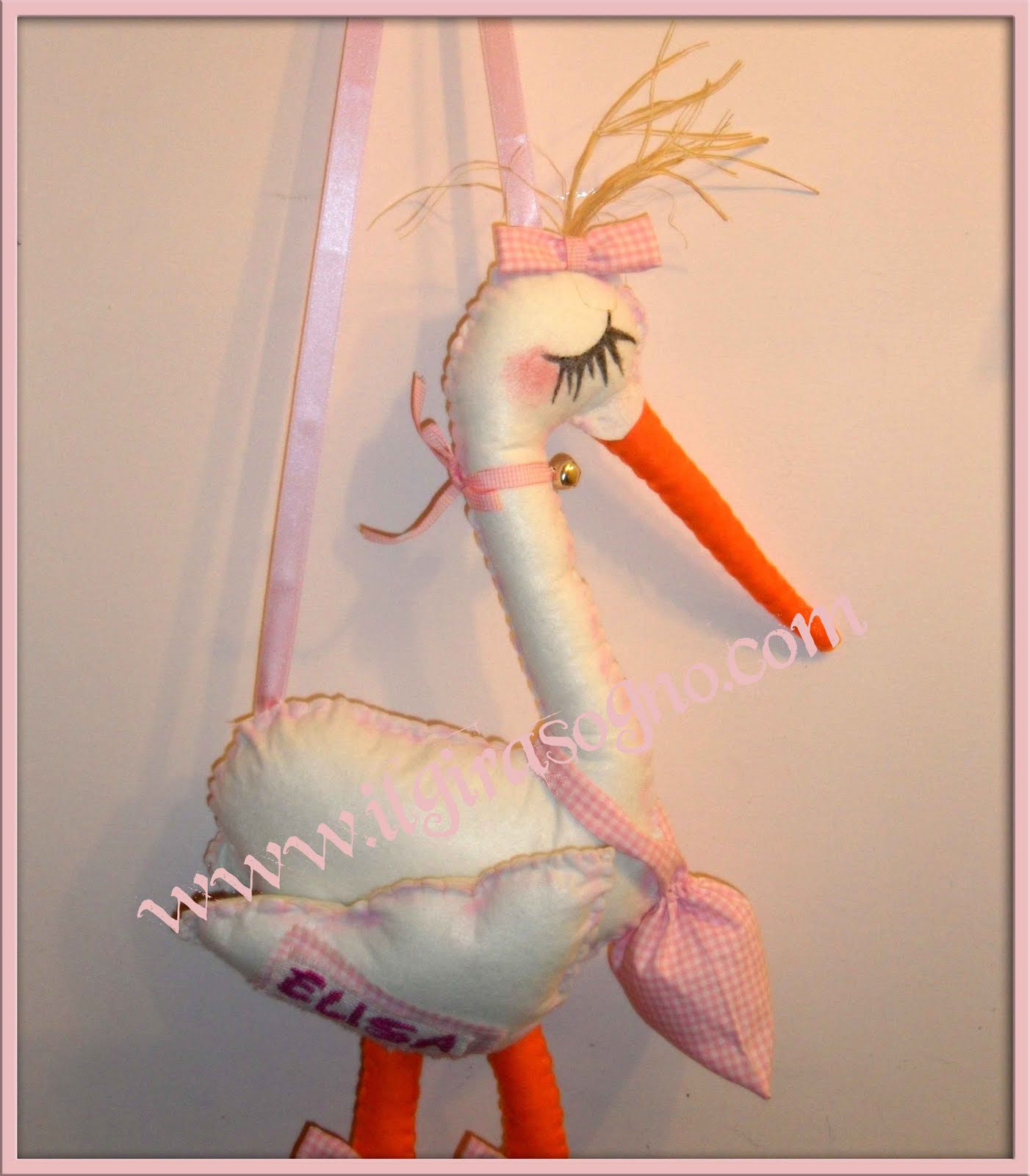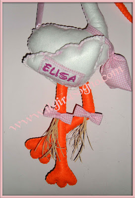 Ma quanti bimbi stanno nascendo in questo periodo! E' in arrivo una piccola fagottina rosa si chiama ELISA e noi del girasogno facciamo tantissimi auguri a mamma e papà!! Ecco la sua cicogna completamente cucita a mano e personalizzata con il suo nome!!!