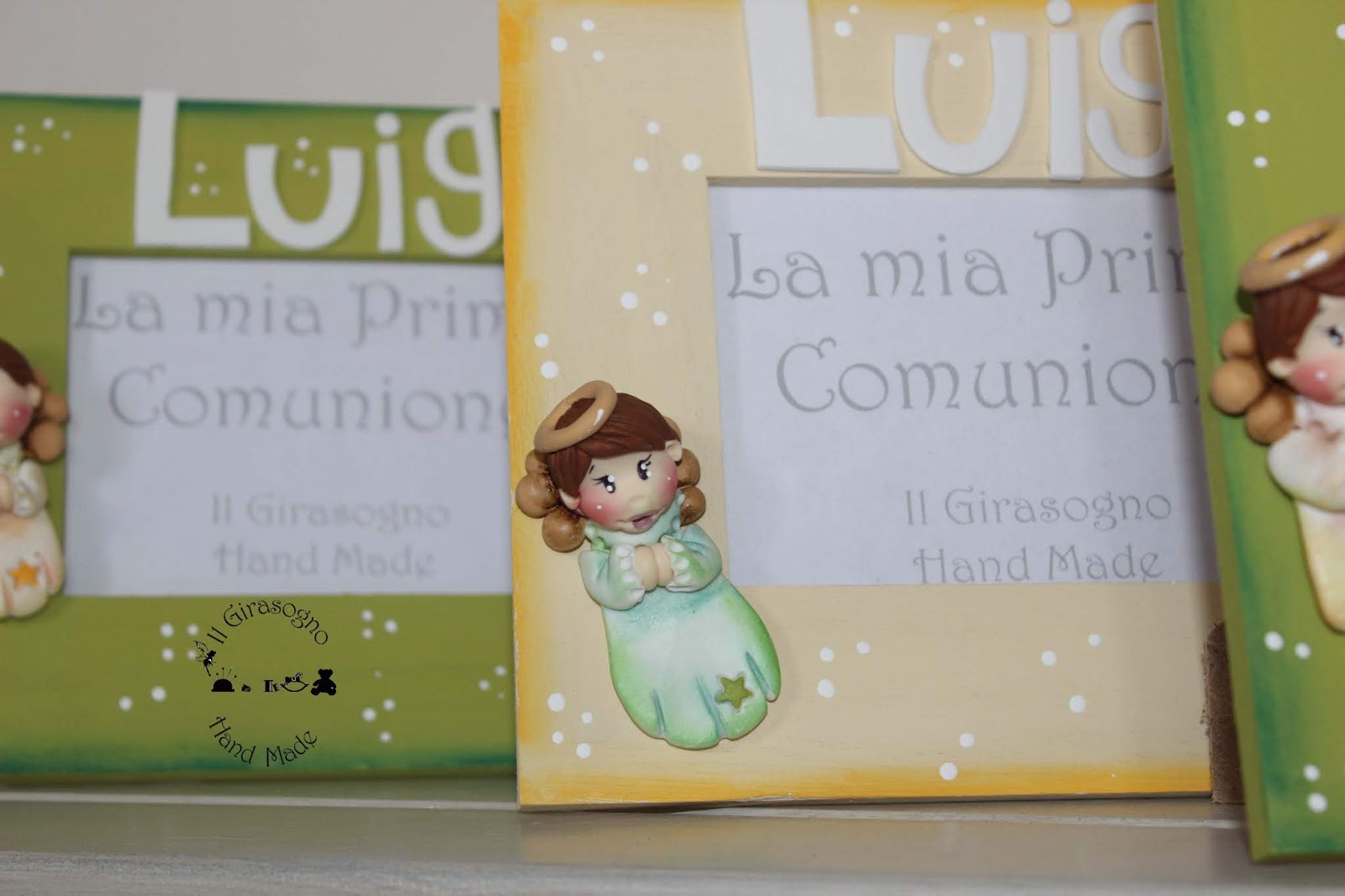 Bomboniere portafoto realizzate per la Prima Cominione di Luigi, un dolce angioletto modellato e dipinto a mano in porcellana fredda , personalizzate con nome!